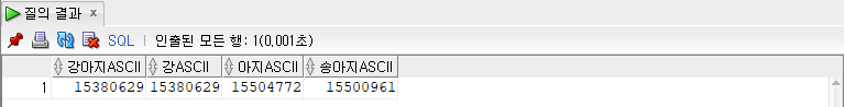 -- ascii 의 경우 첫글자만 가지고 아스키값을 구함.