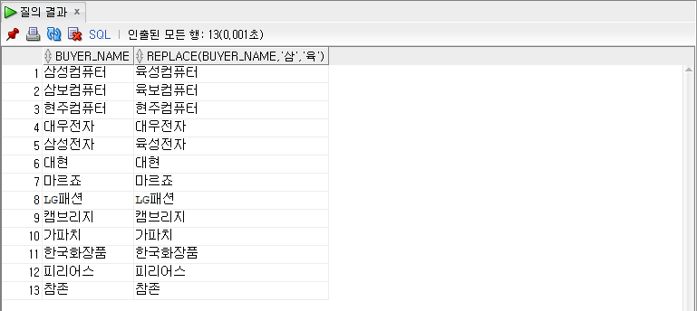 select mem_name, replace(mem_name, '이', '리') name from member;