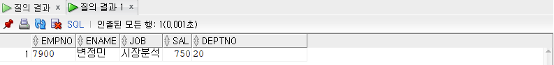 단일 행 서브쿼리 : select문장으로 부터 단 하나의 행만을 검색