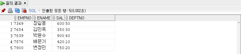 단일 열 서브쿼리 : select문장으로 부터 단 하나의 열만을 검색