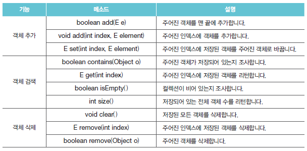저장 용량이 자동으로 증가한다는 특징이 있으며 배열을 추가, 삭제, 검색을 위해 다양한 메소드를 제공한다.