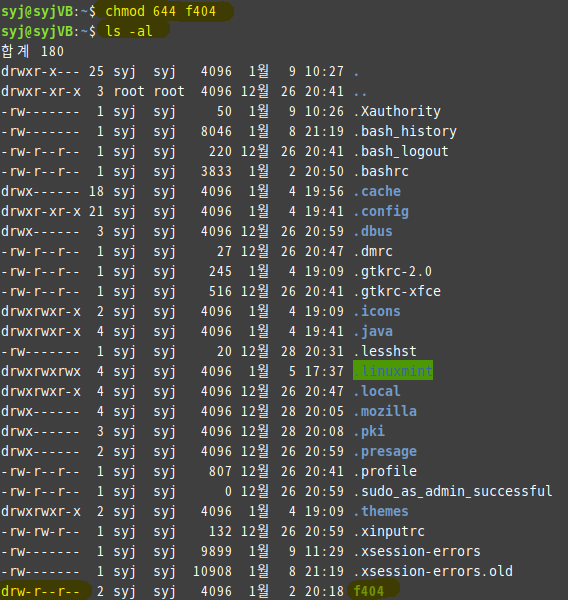 | chmod 권한 파일명 | 권한 제어 명령. chmod 755 를 가장 많이 쓰임. (ls -l로 권한 까지 확인 가능) (ex) 755 -> -rwxr-xr-x) |