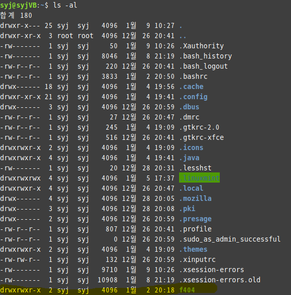 | ls -al | 현재 디렉토리 파일목록 + 파일목록의 옵션 확인 + 숨김파일까지 표시 (파일명이 .으로 시작하는 경우 숨김 파일을 이야기함) |