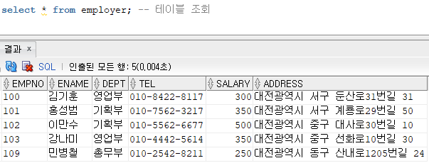 values('101', '홍성범', '기획부', '010-7562-3217', 350, '대전광역시 서구 계룡로29번길 50');