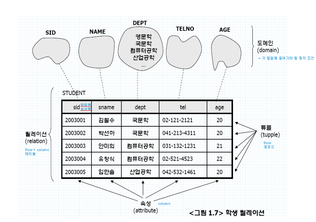 | 튜플(tuple) | 레코드(record) | 행(row) |
