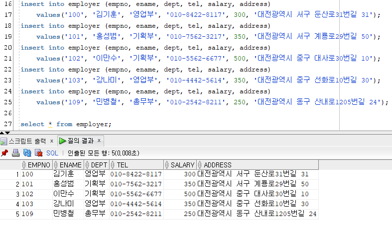 values('103', '강나미', '영업부', '010-4442-5614', 350, '대전광역시 중구 선화로10번길 30');