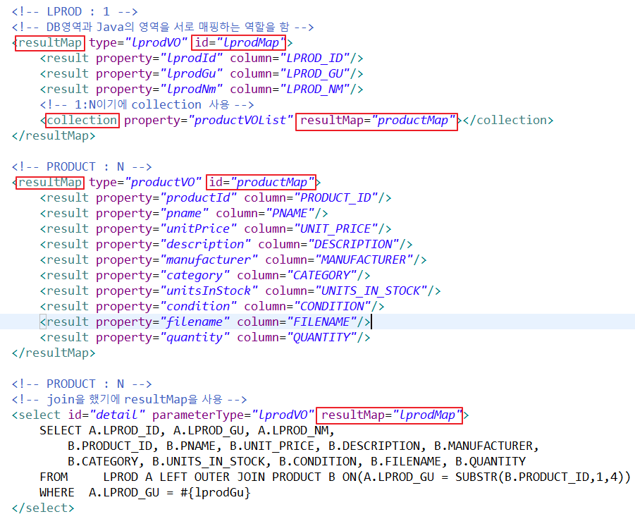 lprodVO에서 1:N으로 사용했기에 collection 을 사용 (collection의 property의 이름은 vo에 있는 이름과 같아야 함)