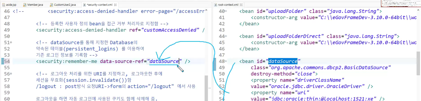 security:logout 에서 delete-cookies를 설정 security:remember-me에서 DB 정보 기입 후 쿠키 유효시간 설정 => 자동으로 PERSISTENT_LOGINS 테이블에 들어감(테이블의 이름과 컬럼 갯수 등 수정하면 안 됨. 자체적으로 제공해주는 기능이기에 그대로 사용해야함)