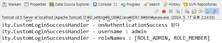 <security:user name="admin" password="{noop}1234" authorities="ROLE_MEMBER,ROLE_ADMIN"/>