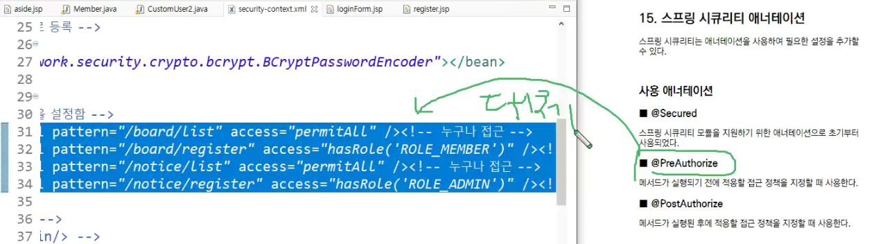 - pre-post-annotations="enabled" -> 골뱅이PreAuthorize, 골뱅이PostAuthorize 활성화