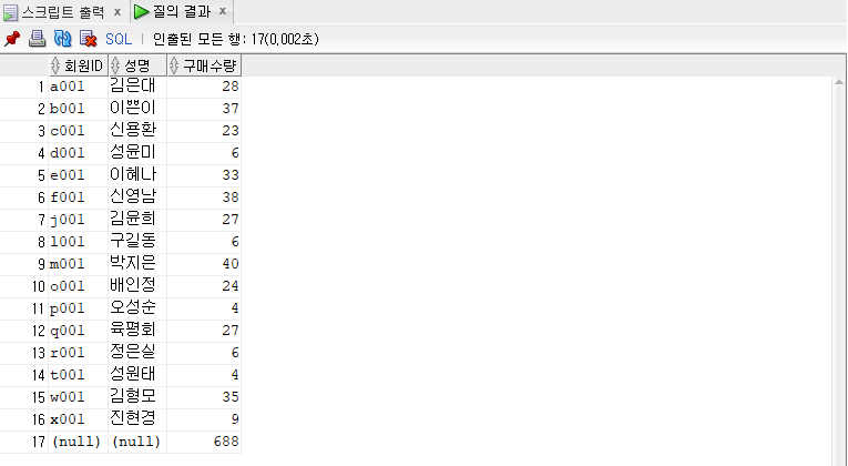 -- 회원id, 성명, 구매수량의 합