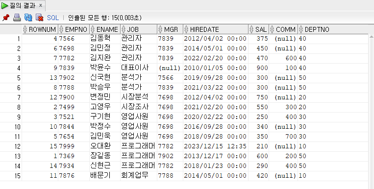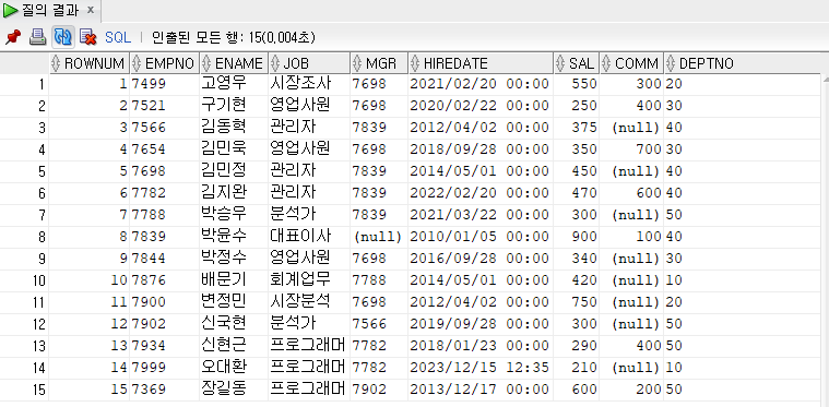 from절 상의 서브쿼리 (inline view) : from절 상에 오는 서브쿼리로 view처럼 작동