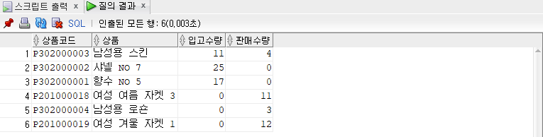 -- 상품코드, 상품명, 입고수량의 합, 판매수량의 합