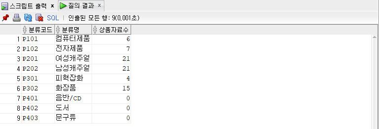 -- (left) outer join과 ansi (left) outer joi의 경우 상품 자료수가 없어도 다 보여짐.