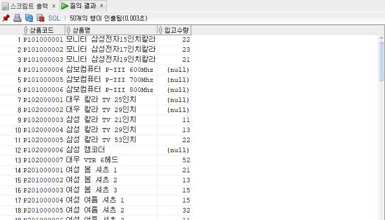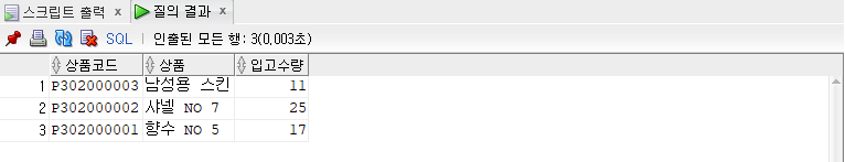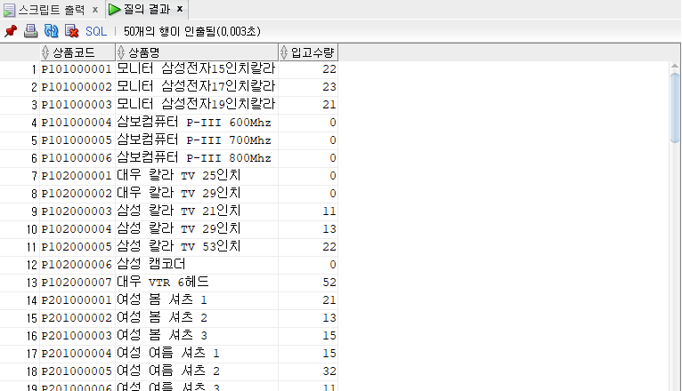-- 상품코드, 상품명, 입고수량