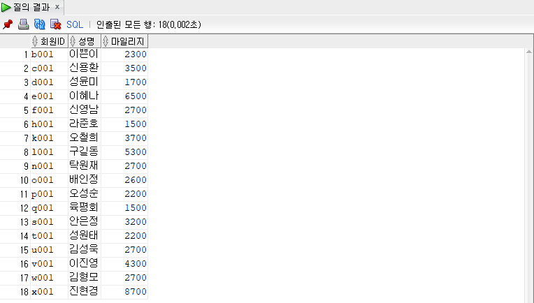 select b.mem_id 회원ID, b.mem_name 성명, b.mem_mileage 마일리지