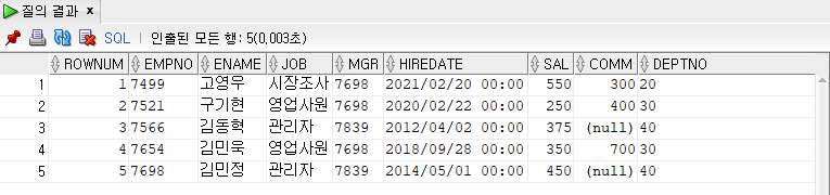 결과 화면7 : exists 연산자 - 서브쿼리의 데이터가 존재하는지 여부를 따져 존재 시 그 값만 반환
