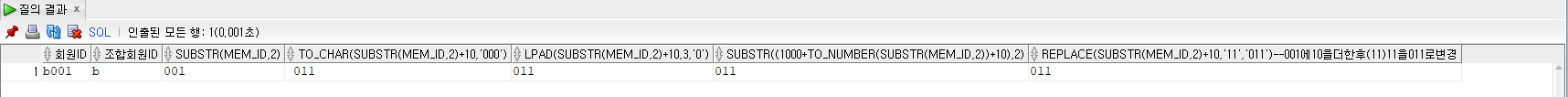 replace(substr(mem_id, 2) + 10, '11', '011') -- 001에 10을 더한 후(11) 11을 011로 변경