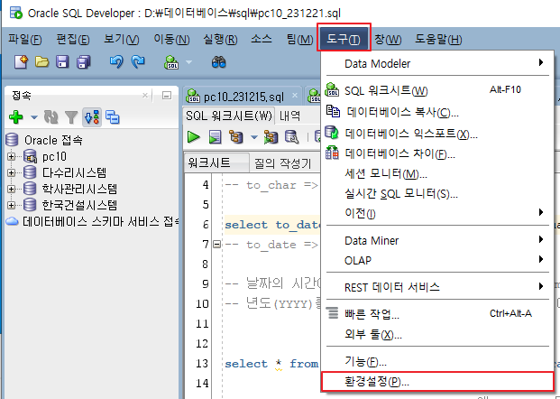 날짜 타입 SQL Developer에서 출력되는 날짜 타입의 형식을 변경할 수 있다. 기본 설정의 경우 RR/MM/DD의 형태로 되어 있다. 년도인 YYYY을 RR로 사용할 경우 50~90년은 1900년대로, 00~49년은 2000년대로 변