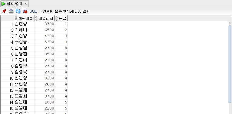 -- 회원 테이블에서 회원이름, 마일리지, 등급을 출력하시오.