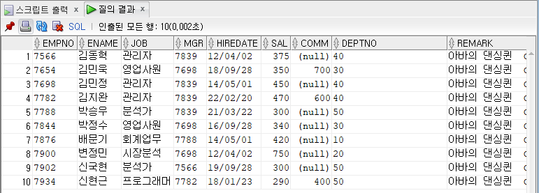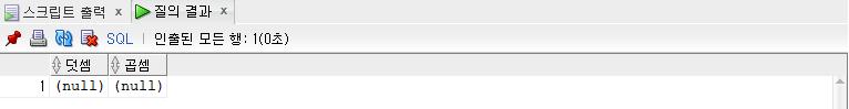 select null+10 덧셈, 10*null 곱셈 from dual;