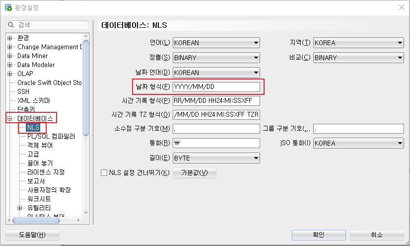 하단의 날짜 형식 을 변경하여 날짜 형식을 YYYY/MM/DD HH24:MI 을 변경하였다.