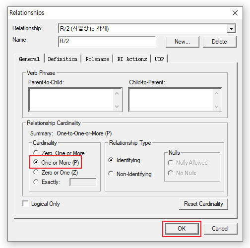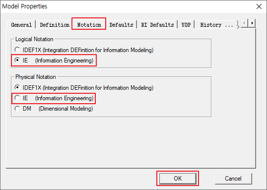 ERwin Data Modeler (5장의 테이블 명세서를 기반으로 ER 다이어그램을 작성한다. 사용하는 프로그램은 ERwin Data Modeler 이다. 설정 정보공학 표기법을 사용하기 위해 아래와 같은 방식으로 ERwin을 설정