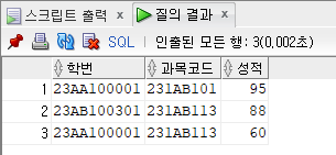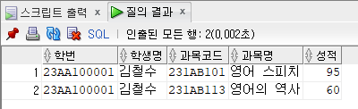 -- 2. 과목코드가 231AB101 과목의 수강현황을 학번, 학생명, 과목코드, 과목명, 성적순으로 조회하시오.