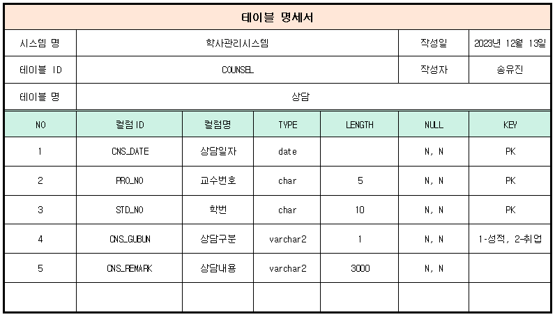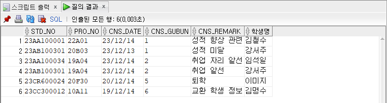 values ('23-12-14', '22A01', '23AA100001', '1', '성적 향상 관련');
