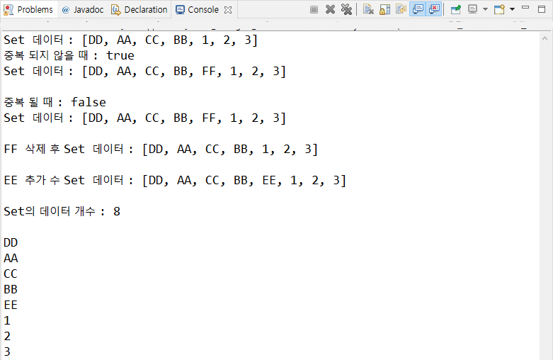 System.out.println("EE 추가 수 Set 데이터 : " + hs1);