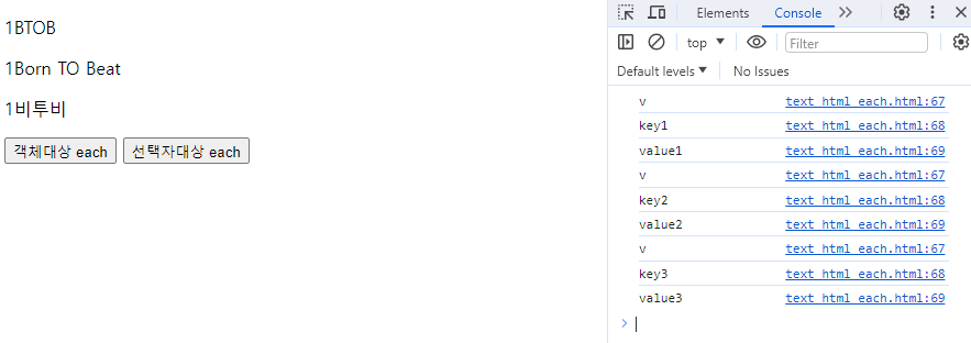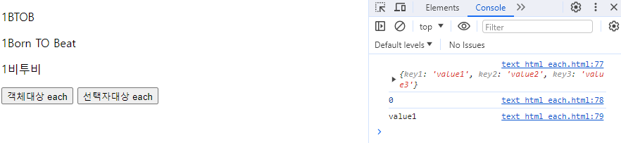 // 선택자 대상 each문법 - $('선택자').each(콜백)의 선택자 위치에 객체를 넣었을 때