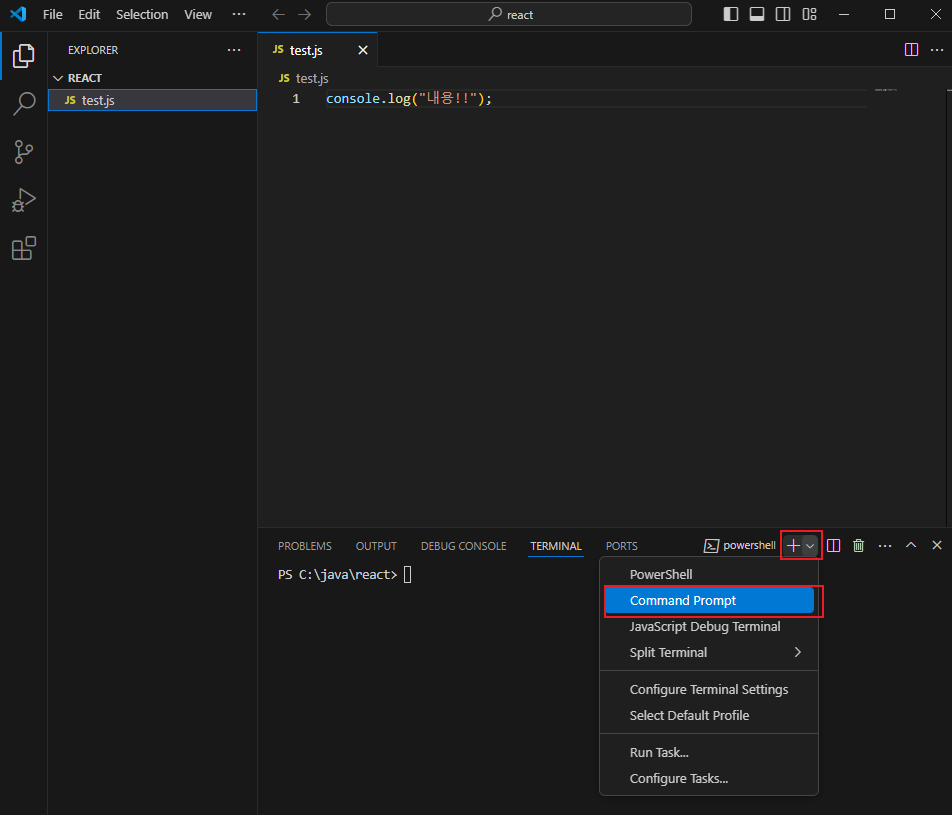 1. + 버튼 클릭 > Command Prompt 클릭